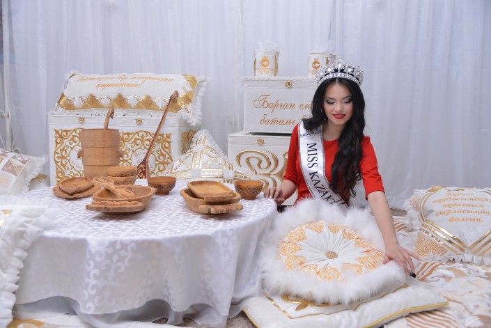 "Мисс Казахстан-2015" Алия Мергембаева из Актау получила в подарок кроме денежного приза традиционное казахское приданое от Дома авторского дизайна "Алтын Орда", сообщает корреспондент Tengrinews.kz.