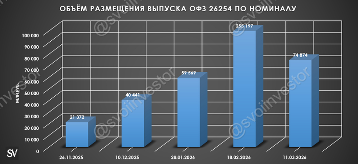 Спрос в 26254 составил 70,8₽ млрд, выручка — 32,2₽ млрд (средневзвешенная цена — 91,87%, доходность — 14,86%). Спрос в 26235 составил 106,4₽ млрд, выручка — 42,3₽ млрд (средневзвешенная цена — 72,66%, доходность — 14,18%). Минфин заработал за этот аукцион 74,5₽ млрд (в прошлый — 200,1₽ млрд). Министерство планирует разместить ОФЗ во II кв. 2026 г. на 1,5₽ трлн (разместили 307₽ млрд, осталось 11 недель). Минфин в очередной раз зарегистрировал 6 доп.выпусков (ОФЗ-ПД) на сумму 1₽ трлн (до этого на 2,5₽ трлн), которые доступны с 18 марта.