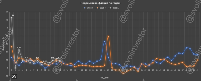 🔔 По данным Росстата, за период с 31 марта по 6 апреля ИПЦ составил 0,19% (прошлые недели — 0,17%, 0,19%), с начала месяца 0,17%, с начала года — 3,15% (годовая — 5,95%). Недельные темпы остаются высокими из-за продолжающегося подорожания топлива/внутреннего туризма (отдых на БВ стал опасным) и резкого ослабления ₽ в середине марта, темпы находятся выше прошлогодних данных, поэтому годовая выросла (прошлогодние недельки: 2025 г. — 0,16%, 2024 г. — 0,16%). Месячный пересчёт мартовской инфляции составил 0,60% (недельные данные показывали тоже 0,60%), что вполне приемлемо (~6% saar), учитывая потрясения месяца.