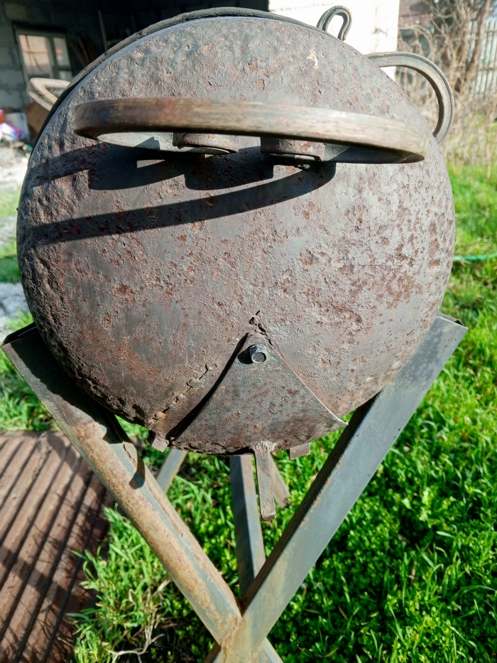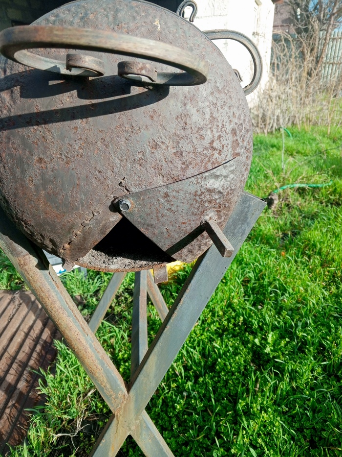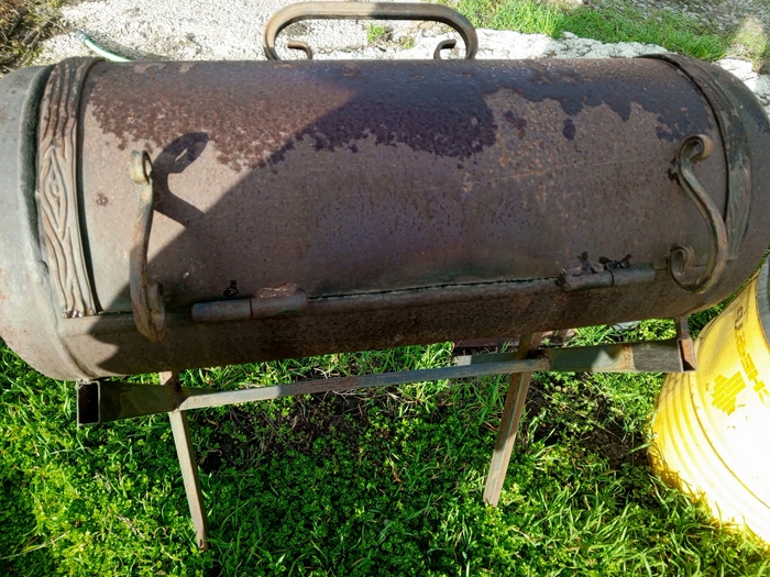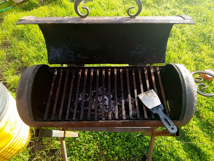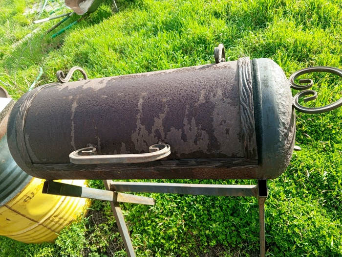Что в нём готовилось из сложного - курица и рулька целиком на остатках жара . Просто закинули на решетку в качестве пьяной забавы и забыли на ночь. Утром была курица горячего копчения.