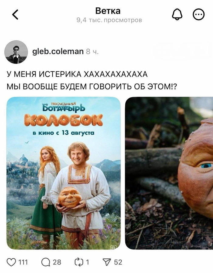 Это переосмысление старой сказки. История уже не про милого румяного Колобка, вызывавшего аппетит у встречных зверей.