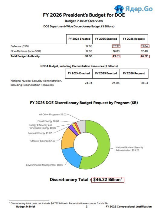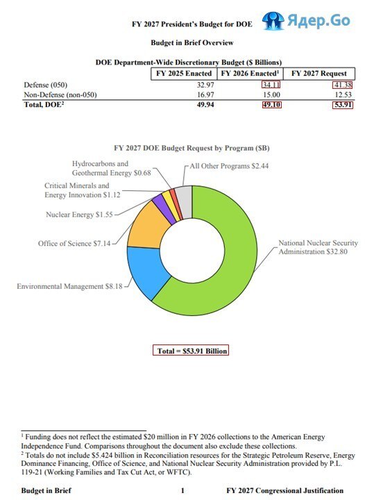 Согласно Краткому обзору бюджета на 2027 финансовый год Министерства энергетики США общий запрашиваемый бюджет ведомства составляет порядка $53,91 млрд. Из них: