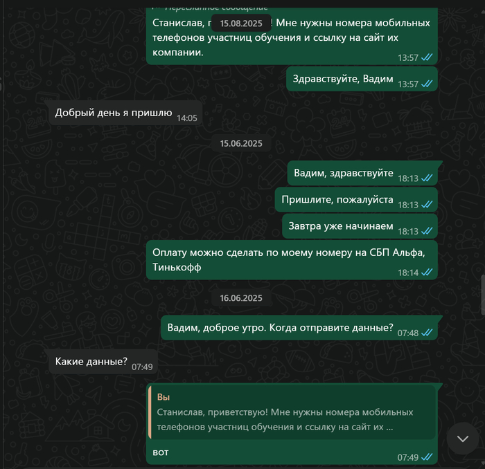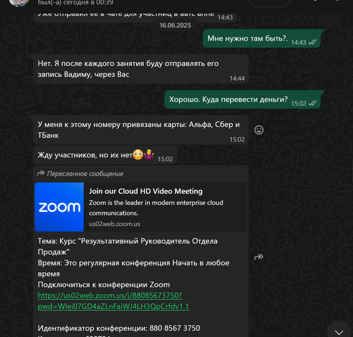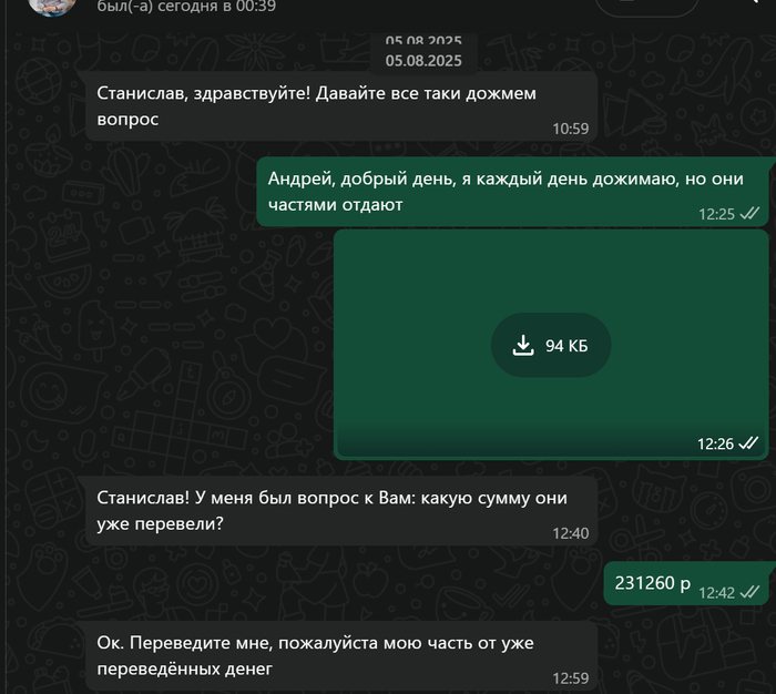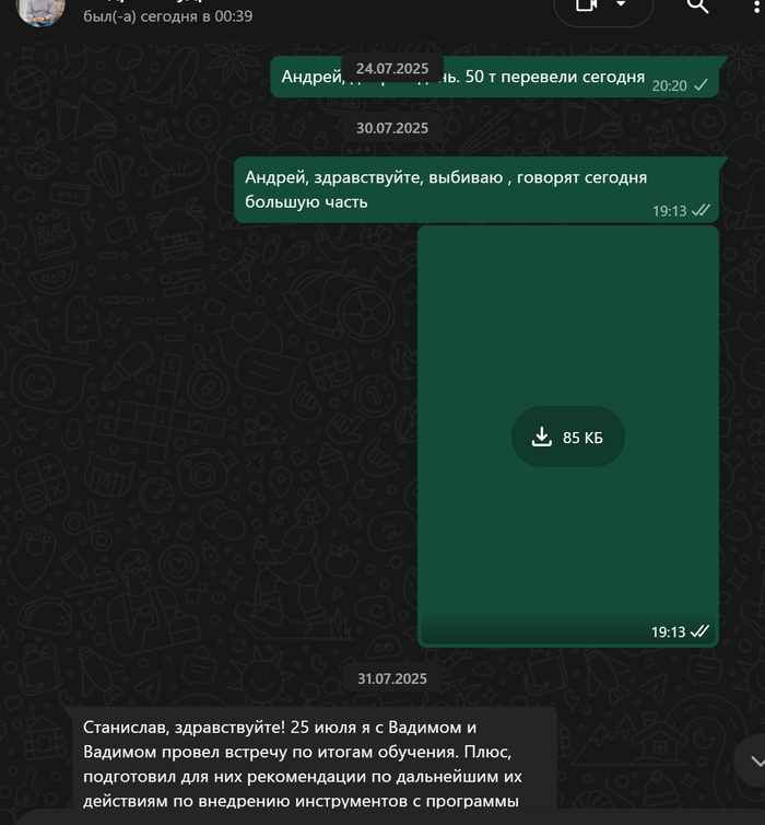 Июль 2025 — после окончания обучения перевели 131 250 ₽ частями. Потом ещё 50 000 ₽ и ещё 50 000 ₽. Итого поступило 231 250 ₽ из 650 000. Объяснение: «российские карты блокируют», «будем переводить частями аккуратно».