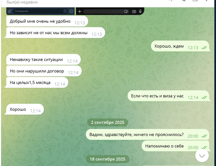 30 сентября — пишу снова. «Вадим лежит с ковидом. Сейчас начнём разбираться с платежами».