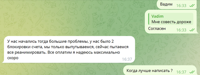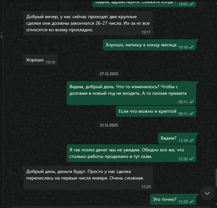 31 декабря — пишу: «Я так понял, денег мы не увидим. Обидно, столько работы проделано и тут скам». Ответ: «Деньги будут! Сделка перенеслась на первые числа января. Это точно. Мы точно заплатим. Просто попали в кассовый разрыв».