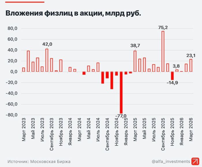 Из них в облиги (возможно, благодаря моей активной просветительской деятельности) занесли аж 226,8 млрд ₽ (+18,9% к февралю). Ещё 19,6 млрд — в паи фондов, а в акции — 23,1 млрд ₽ (это на 62,7% больше февральских покупок акций!).