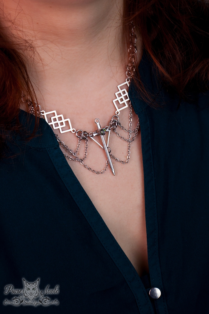 Колье на самом деле достаточно миниатюрное и легкое, а уколоться клинком... можно, но крайне сложно =)