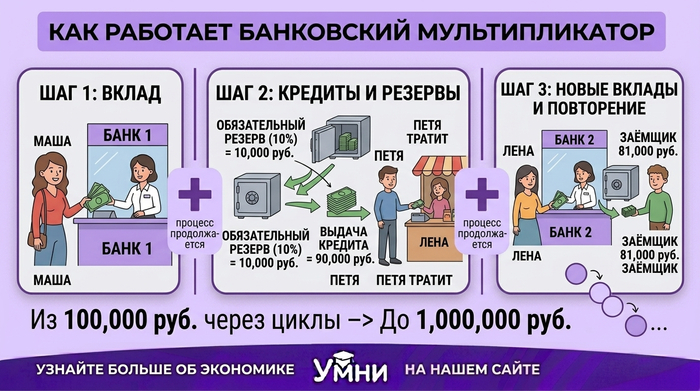 Цепочка продолжается. Из одного депозита в 100 000 рублей через несколько циклов в экономике появляется до миллиона. Это называется