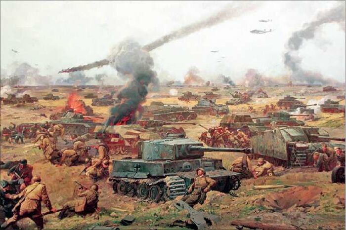 С картиной из репортажа телеканала всё очень непросто. Сама картина интересная. В изображении совмещены образцы техники и вооружения разных лет и с различных участков фронта, пропорции отличаются и т.д. Так часто бывает на картинах художников.