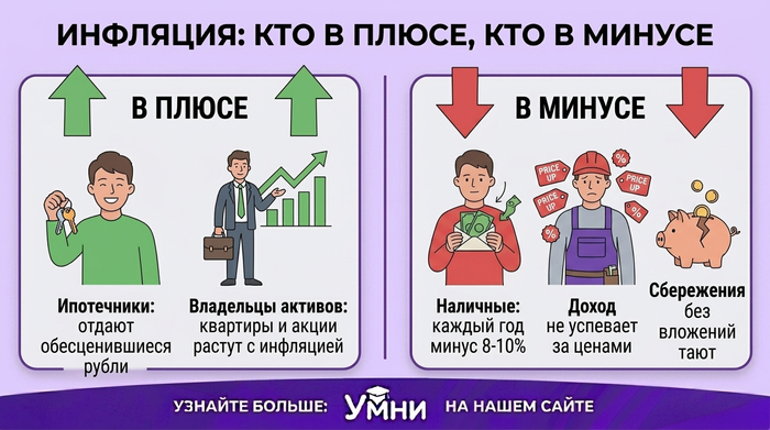 Те, кто должен, оказываются в плюсе. Ипотека на 5 миллионов, взятая сегодня, через 10 лет при 8% инфляции - это совсем другие деньги. Возвращаются рубли, которые стоят дешевле тех, что брали. Этот принцип работает для любого долгосрочного долга. Отчасти поэтому экономисты и считают умеренную инфляцию нормой - она подталкивает к действию, а не к ожиданию.