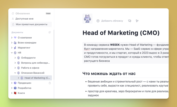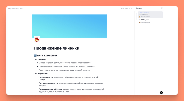 Да, это долго и муторно. Но оно того стоит. А ещё можно сделать так, чтобы каждый сотрудник мог вносить изменения в документы в любое время и актуализировать информацию. Если страшно, что информация будет безвозвратно потеряна.ю но советуем пользоваться сервисами, где отображается история обновления документов. Например, как в Weeek