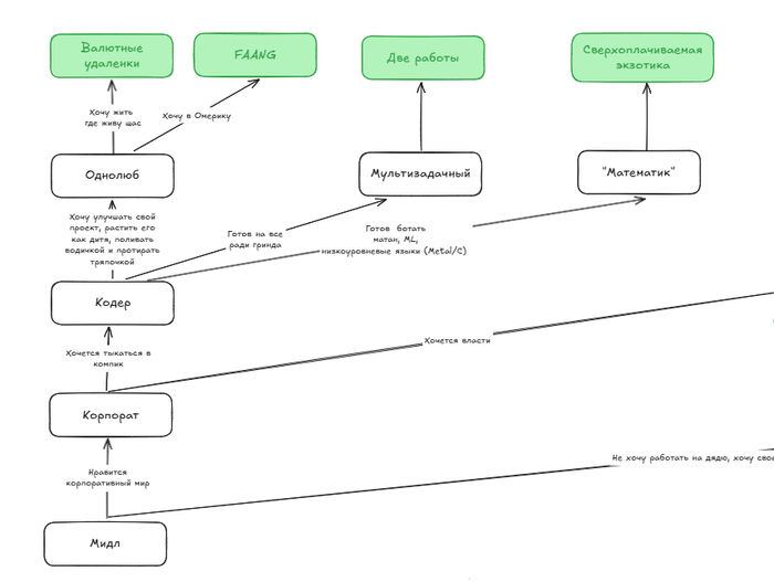 Кодер-математик. Если вы готовы учить матан, разбираться в ML, погружаться в низкоуровневые языки — можно выбрать эту ветку развития. Тут очень сложно развиваться с мотивацией «Хочу больше денег», но если реально интересно погружаться в сложности, то выбор отличный.