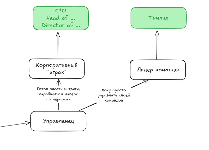 Корпоративный игрок. Вам нравится коммуницировать с людьми и хочется расти по корпоративной иерархии. Можно быть CIO, CSO и другие Chief, Head of…, Director of… Важно уметь брать на себя ответственность, делегировать, лидить фичи.