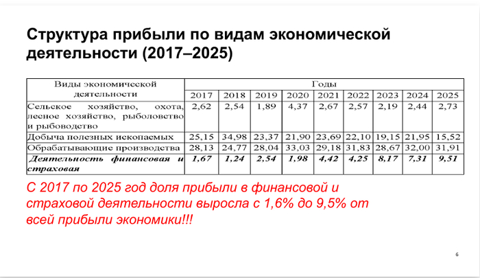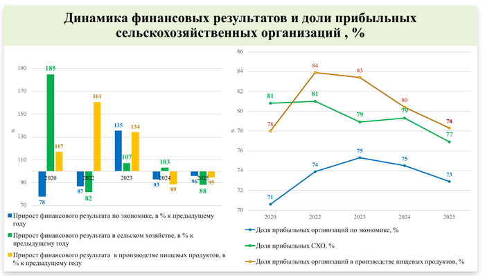 Научный анализ структуры прибыли по видам экономической деятельности за 2017–2025 г.г. указал на заметное отставание сельхозотрасли. Так в период с 2017 по 2025 годы, (Данные от члена-корреспондента РАН Андрея Колесникова), абсолютные величины прибыли по отрасли колебались в пределах значений от 1, 89 в 2019 году, до – 4, 37 в 2020 году. Другие отрасли, например, «Добыча полезных ископаемых» показали значения от 15, 52 в 2025 году, до 34, 98 в 2018 году, «Обрабатывающие производства» сумели сохранить уровень прибыльности в пределах 24-32%%, а финансовый сектор за то же время вырос почти в 6 раз.