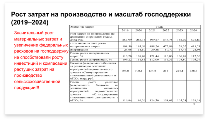Версию о том, что прямое вливание «государственных денег» в АПК, без внятного стратегического подхода малоэффективно поддерживает большая наука. Так, по данным члена-корреспондента РАН Андрея Колесникова кредитование АПК и бюджетная поддержка в период с 2019 по 2025годы возросли примерно на 30-40 %%, что, увы, не отразилось на результатах роста отрасли.