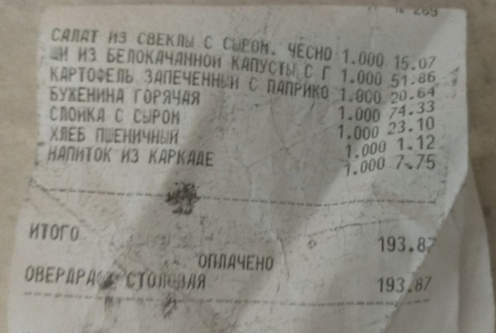 В столовке цены просто великолепные, их дотирует компания. Если не шиковать, 300-400 рублей в день на еду хватит с головой. Я ходил только на завтрак и обед либо ужин, потому что наедался и третий прием пищи был особо не нужен.