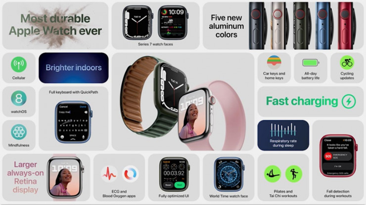 По словам представителя компании, часы iWatch Series 7 станут более прочными и пыленепроницаемыми, а также обретут retina-дисплей. Батарея часов рассчитана на 18 часов работы. Цена новинки - 399 долларов.