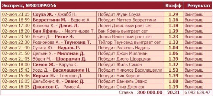 Игрок букмекерской конторы Tennisi.kz собрал крупный "экспресс" на матчи текущего "Уимблдона" и выиграл больше шести миллионов тенге, сообщает пресс-служба компании. При ставке в 300 тысяч тенге на исходы событий в 14 матчах сразу выигрышный коэффициент его билета составил 20,31. Нужно отметить, что такой точный экспресс казахстанец, чье имя не разглашается, собрал онлайн на сайте Tennisi.kz.