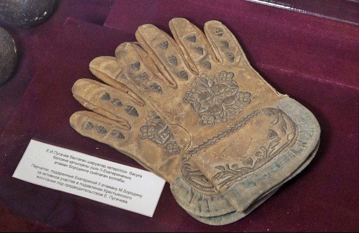 В числе удивительных экспонатов, оставшихся с тех времен, - кожаные перчатки, вышитые золотыми нитями, которые Екатерина II подарила атаману Бородину, сопровождавшему Пугачева на казнь в Москву.