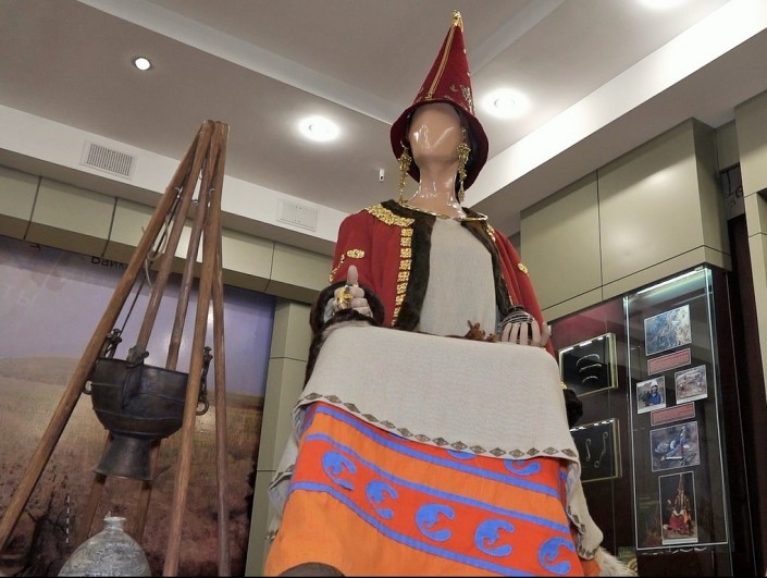 Женщина принадлежит племени саков-тиграхауда, носивших остроконечные шапки. Ее возраст - 17-20 лет. Принадлежность к знатному роду подтверждают 80 золотых украшений, две стражницы, захороненные рядом, и уникальный гребень, на котором изображена батальная сцена между сарматами и персами.