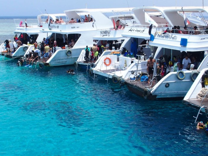 И вот мы у цели: риф Джексон, несчастная "Лара" и выстроившиеся в ряд, как на стоянке, яхты - экскурсия пользуется популярностью. А в воде уже вовсю бултыхаются десятки человек, к которым, натянув маски и ласты, присоединяемся и мы в ожидании своей очереди на погружение (на яхте все участники были разбиты на партии по три человека - по количеству инструкторов).