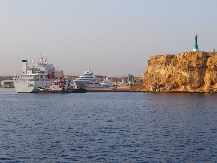 Рано утром мы отправились на своем веселом желтеньком автобусе в порт Наама-Бей, расположившемся в одноименной бухте города. После проверки документов и содержимого сумок (на Синае много полицейских постов) мы оказались в гавани, где среди белоснежных яхт черной махиной возвышалась парусная яхта "Black Pearl" ("Черная жемчужина"). Это был "пиратский" корабль, самый большой в Шарм-эль-Шейхе, построенный специально для туристов. Как рассказал наш гид, у "пиратов" там очень красиво - множество ярких тематических скульптур, а аниматоры устраивают целые представления. На паруснике можно отправиться и к острову Тиран, и в национальный парк-заповедник Рас-Мохаммед, вот только из-за высоких бортов и отсутствия верхней палубы обзор будет ограничен. Во всяком случае, лежать на солнце, загорая, и одновременно любоваться морским простором и прибрежными видами не получится. Зато, наверное, удастся распугать всех акул, которые в Красном море изредка о себе напоминают.