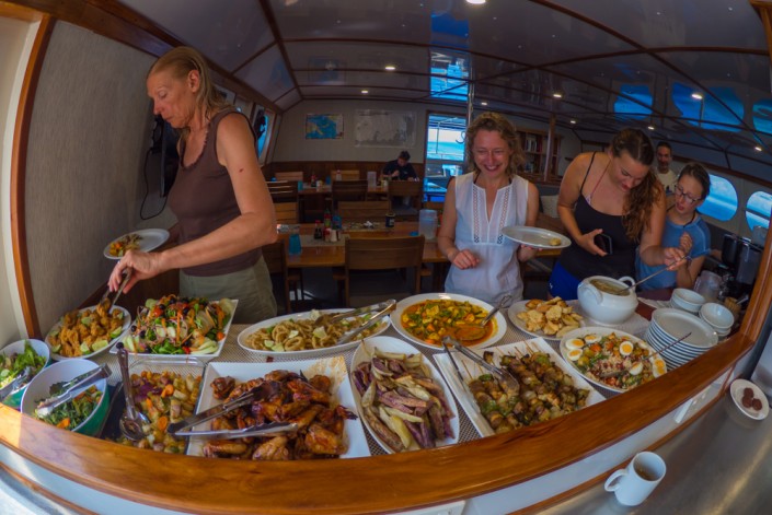 На нашем кораблике капитан рекламирует поваров. Еда и вправду прекрасная. Банановая, блюд с десяток: жареные бананы, чипсы, со специями, остренькие, на второе в качестве гарнира – тушеные бананы, десерты – кексы, мороженое. Банановый рай! И остальные блюда весьма эстетичны: салатики – что тебе во французском ресторанчике, маленький супчик-пюре, рыба или затейливое мясо. Команда – от капитана до ночного сторожа – сама элегантность, все ежевечерне одеты в парадную белую форму с погонами; разносят еду каждому из нас.