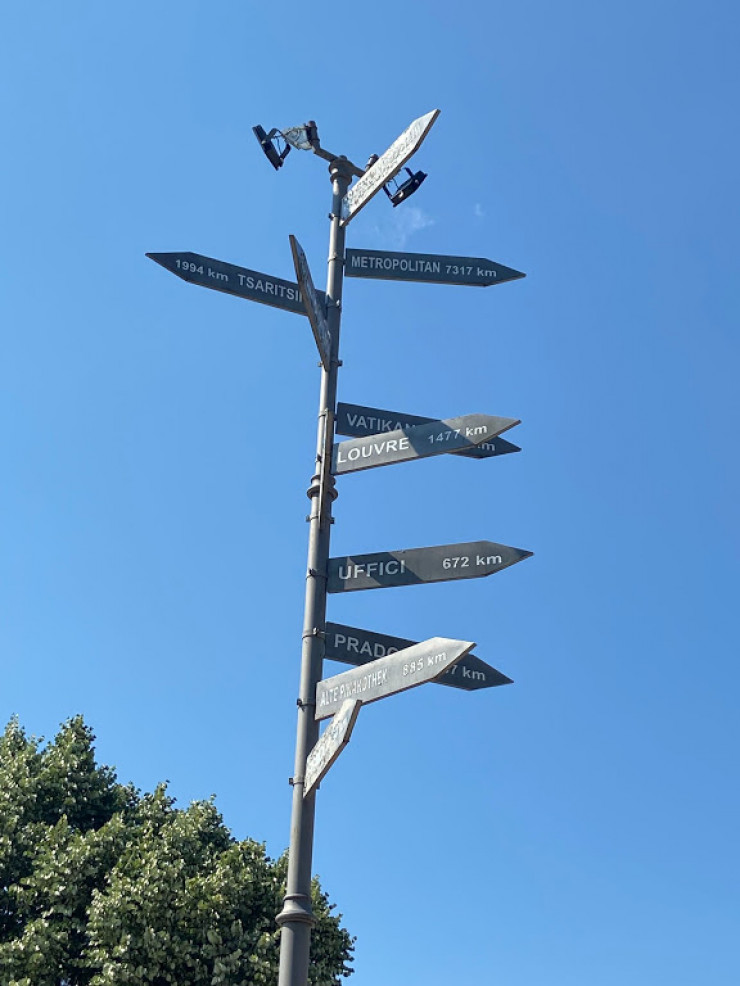 На Дворцовой площади, помимо кафе, есть пара занимательных вещей. К примеру, столб с указанием расстояния до самых знаменитых музеев мира.