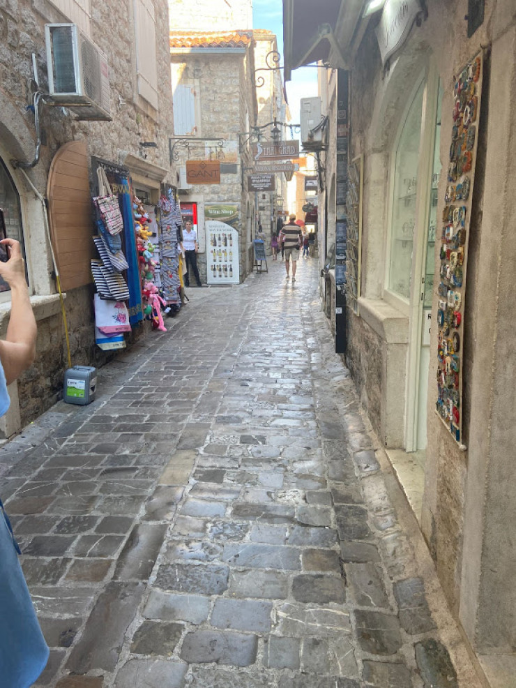 Старый город Будва со стороны напоминает собой аванпост, или мини-крепость с узкими улочками, наполненный кафешками (пиво от двух евро) и магазинчиками с сувенирами (они начинаются от одного евро).