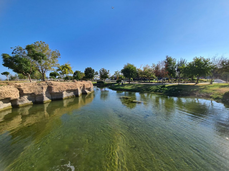 Возле водопада расположился просторный парк в районе Лара, где туристы сидят на лавочках или газонах и наслаждаются бризом.