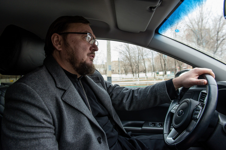 На дорогу ушло минут 40. По пути встретили колонну тех самых автобусов, что собрались на площади. Экскурсантов повезли на специальную смотровую площадку в 1 400 метрах от стартового сооружения. А мы в сопровождении духовного лица расположились примерно на такой же дистанции рядом с группой специалистов и людей в форме МЧС России. Среди них заметили второго байконурского священника, отца Сергия. Большой, жизнерадостный и громкий богатырь в подряснике и скуфейке (головной убор). Поверх надета небесно-голубая куртка с ярким принтом - ракетой "Союз" и по-военному маркированная специальной шильдой, на которой стандартным шрифтом значится: "Отец Сергий. Духовник "Роскосмоса".