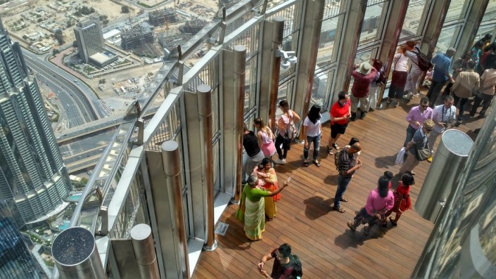 Мы же отправились на самую высокую смотровую площадку действующего рекордсмена, похожего на гигантский сталагмит. Находится она на 148-м этаже, куда вас доставит один из 57 лифтов почти за одну минуту, поднимаясь со скоростью 10 метров в секунду. Кстати, билет на площадку дает право не стоять в очереди к лифту, а по прибытии вам предложат напитки и сладости.