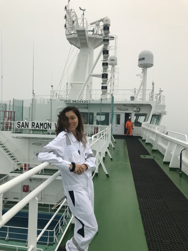 Моими основными задачами были обучение и получение опыта. Делала все: красила поверхности, подвергающиеся коррозии (якори, цепи, палуба, люки и так далее), оперировала гидравлическими машинами для якоря или же швартовых веревок, проводила офицерскую инспекцию объектов безопасности согласно морским регламентам: проверяла огнетушители, спасательные лодки, шлюпки, подъемные краны, грузовые отсеки. Вся эта работа делалась, чтобы получить первый опыт офицерской работы.