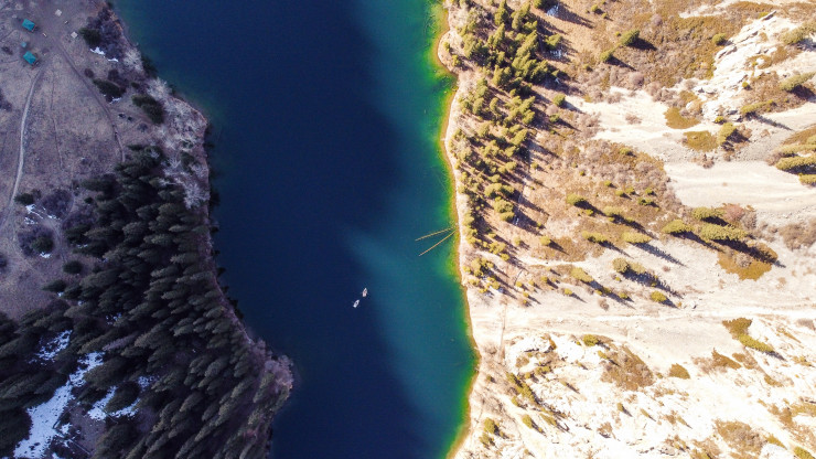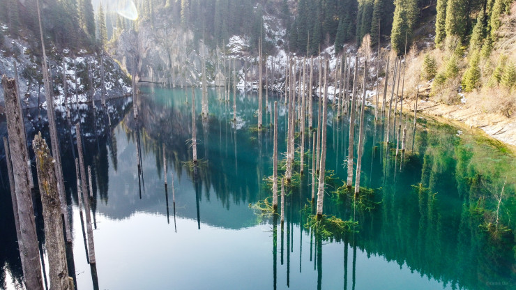 Ученые говорят, что Каинды возникло около 100 лет назад практически случайно - произошел большой обвал горной породы, который перегородил ущелье естественной дамбой. Так получился этот невероятный водоем длиной около 400 метров и глубиной почти 30 метров. Летом, к слову, в озеро можно окунуться - из-за того, что в него втекает горная речка, даже в жарком июле вода в нем ледяная, и такое купание незабываемо. Освежает! Со всех сторон озеро Каинды окружено осыпными каменистыми склонами и крутыми взлетами скал. Выше него - скальный тупик, и только с одной стороны можно подъехать к воде на машине. Со скалистого гребня открываются потрясающие виды на ущелье Саты, долину реки Чилик и само ущелье Каинды.