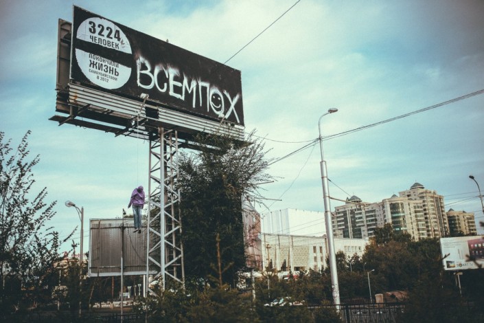 Отметим, что Паша Кас получил известность после таких работ, как "Трусы" с надписью "Год культуры" перед акиматом Алматы, "Свободу попугаям", которую он посвятил "диванным критикам" и другие.