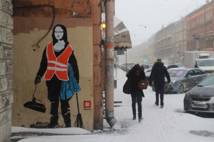 В начале года на стене еще одного дома появилось граффити Паши Каса - "Джоконда в образе дворника". Героиня картины Леонардо да Винчи предстала в необычном образе - в руках у нее веник и совок, а также мусорные пакеты.