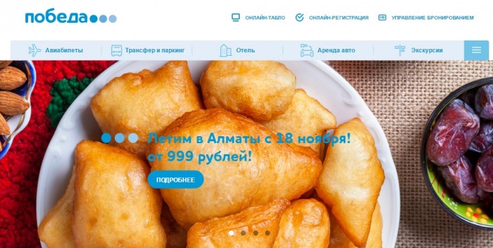 Объявление о рейсах в Алматы на главной странице сайта авиакомпании "Победа".