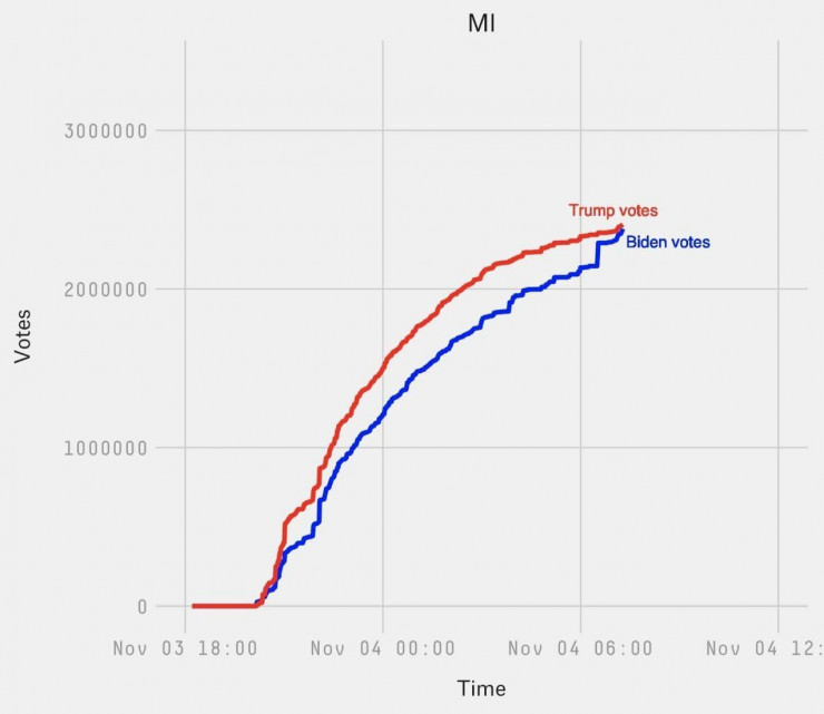 Также прямо сейчас Байден выигрывает в Висконсине и в Неваде. Вместе с Мичиганом этих трех штатов ему теоретически хватает для общей победы.