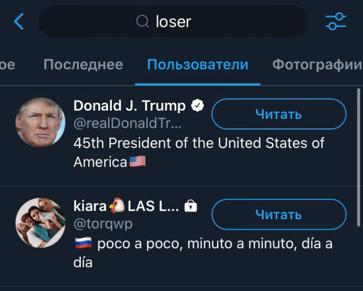 Впрочем, это не единственный онлайн-троллинг, нацеленный на Дональда Трампа. Любого, кому довелось искать слово "loser" в "Твиттере", направляют на профиль действующего президента Соединенных Штатов.