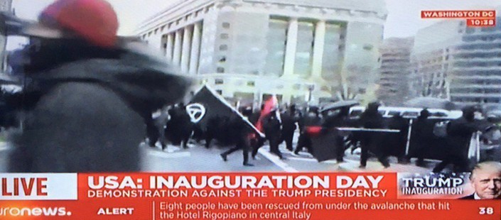21.38. Параллельно с торжественными мероприятиями в Вашингтоне проходят марши оппозиции и анархистов. Протестующие в черных масках с флагами движения анархистов громят витрины магазинов и окна машин.