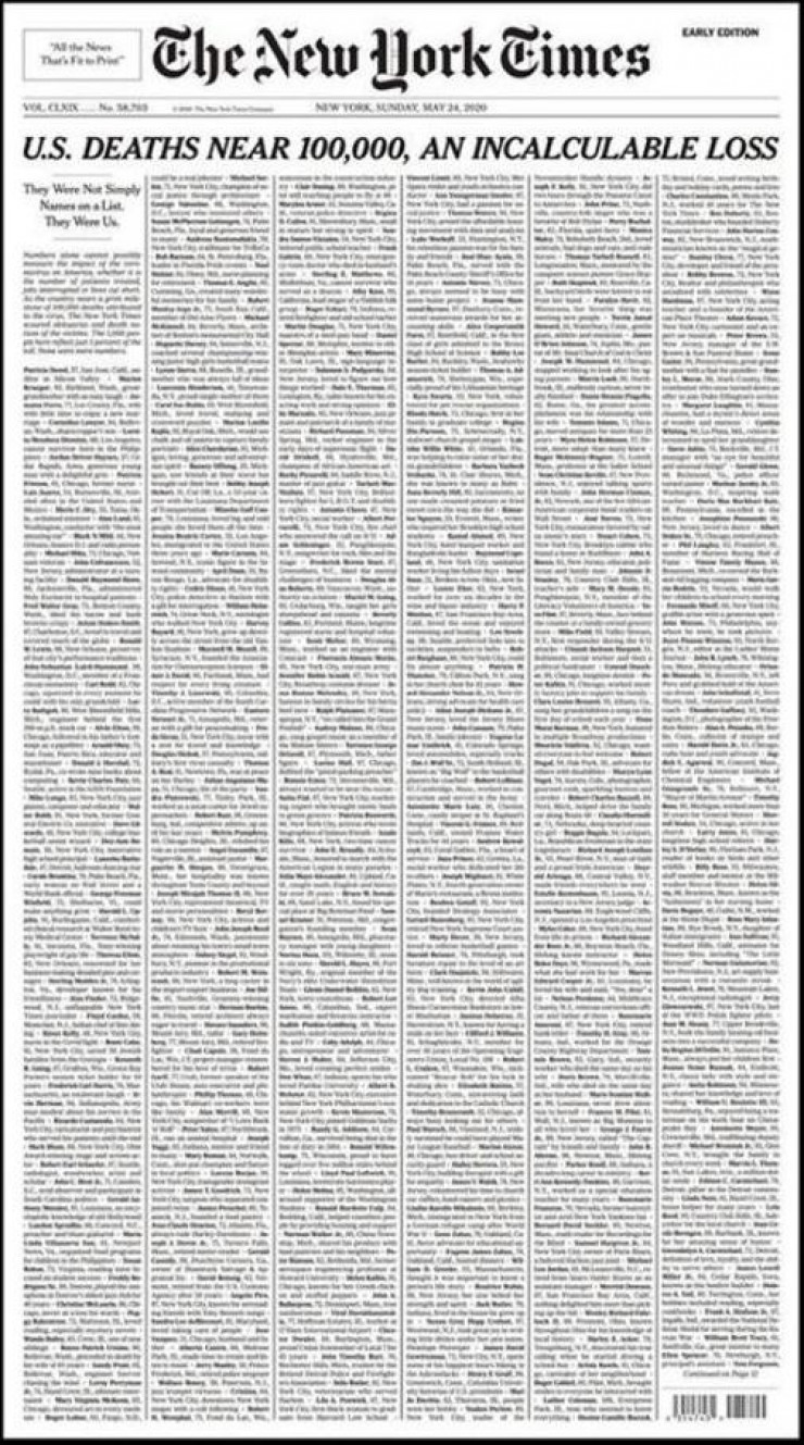 Вместо статей, фотографий или графики, которые обычно появляются на первой странице New York Times, в воскресном выпуске опубликован длинный траурный список людей, чьи жизни оборвались в результате пандемии коронавируса.