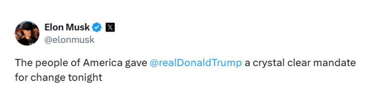 Илон Маск считает, что американцы дали Трампу "кристально чистый мандат на перемены"