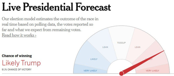 New York Times дает 91 процент вероятности победы Трампа. Но этот показатель еще может измениться.