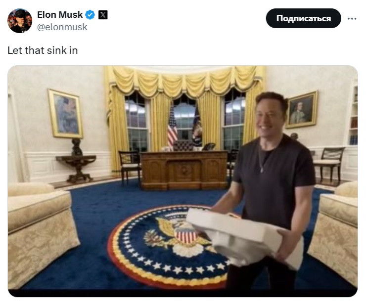 Илон Маск уже шутит. Сторонник Дональда Трампа опубликовал коллаж, где он с раковиной в Овальном кабинете (рабочее место президента США).