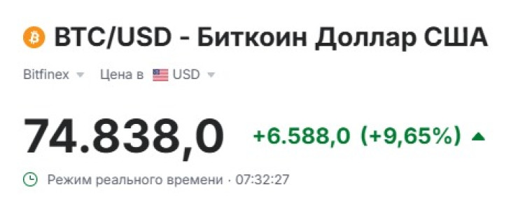 Тем временем биткоин обновил исторический максимум на фоне выборов в США. По состоянию на 09:04 по времени Астаны дорожал на 8,64 процента - до 74 120 долларов (36 миллионов 348 тысяч 745 тенге).