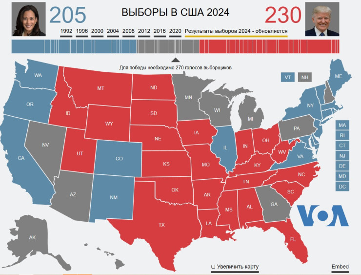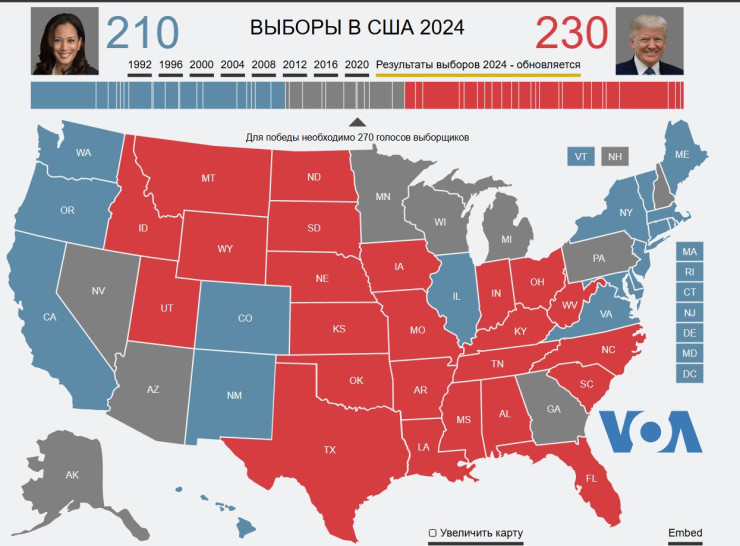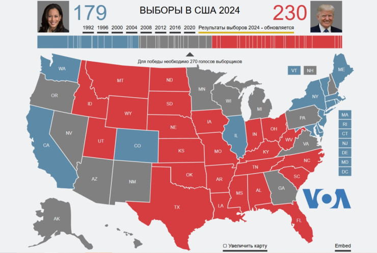 Associated Press приводит такую статистику: Трамп - 230 голосов, Харрис - 187. Похожие данные и у Голоса Америки - 230 против 179.