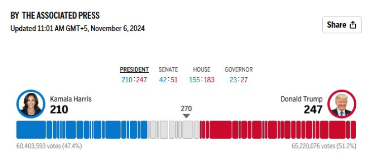 У него 247 голосов, у Харрис - 210, пишет Associated Press.