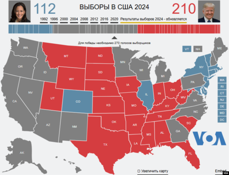 Согласно данным портала Голос Америки, у Трампа 210 голосов выборщиков, у Харрис - 112. Тем временем издание New York Times прогнозирует, что Трамп может рассчитывать на 298 голосов, а Харрис - на 240 голосов.
