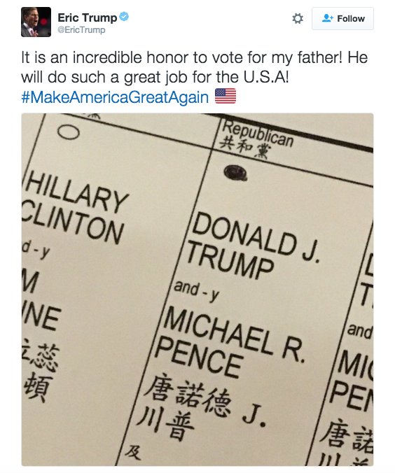 По данным издания, Эрик Трамп разместил фото бюллетеня в своем микроблоге в Twitter. "Это невероятная честь голосовать за своего отца! Он проделает такую большую работу для США", - подписал он фотографию.