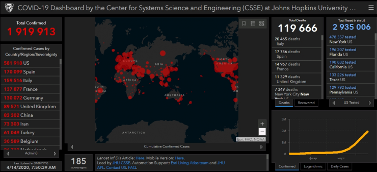 По данным на утро 14 апреля, число зараженных в мире составляет 1 919 913, жертвами коронавирусной инфекции в мире стали уже 119 666 человек. Число выздоровевших приближается к 449 тысячам.